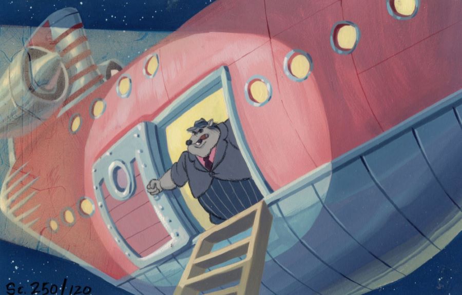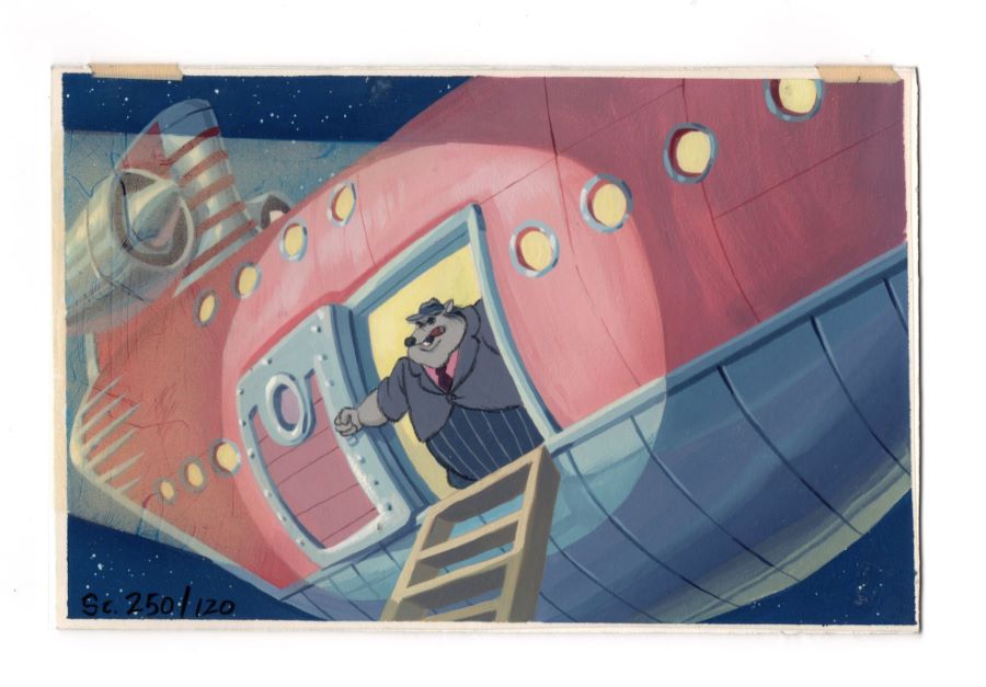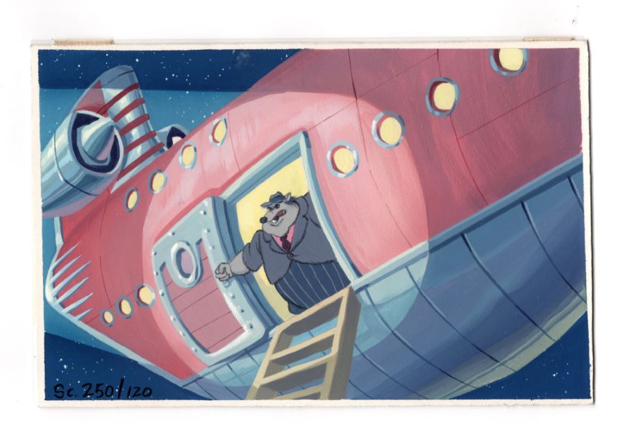 A background color concept that was used during the development of the Don Bluth Productions film Rock-A-Doodle (1992). Featuring a vibrant painting of Pinky in his large pale pink aircraft, the painted concept was created at the studio and used during the early development of the film. Don Bluth Productions uniquely used these concepts not only to develop the scene's color palette, style, and emotion, but also as storyboards to visualize the full story development. Measuring 6.5"x10.75" overall and with the image area measuring 6.25"x10.5", the background color key concept is in very fine condition with a very slight curl to the board.