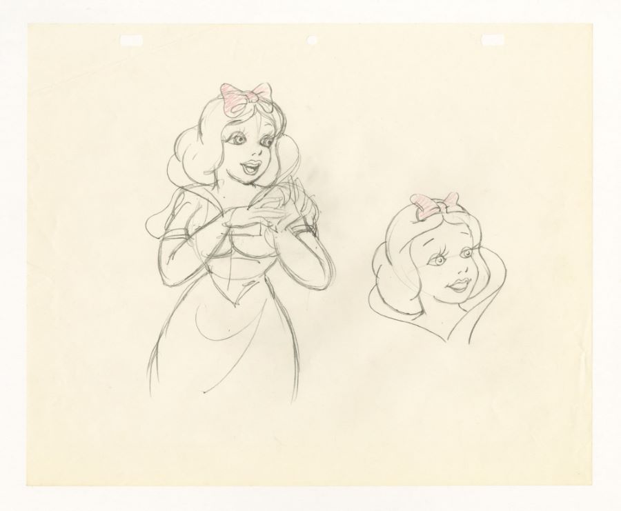 A rough sketch from an unknown Ralph Bakshi Studios animated film (c.1970/80s). Featuring two women with a striking resemblance to Walt Disney Studio’s Princess Snow White, the design sketch was created at the studio. Measuring 10.5"x12.5" overall, with the character image measuring 7"x8", the drawing is in very good condition with light edge wear, including a fold on the upper left corner.